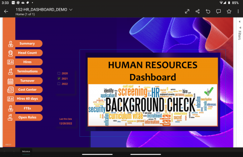 Displays Hire, Termination, Headcount, Turnover, Retention metrics, Job req follow up.